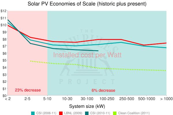 There are economies of scale for distributed solar, especially for very small (residential scale) systems. Historical U.S. data suggests that the savings from size level off beyond 10 kW, but contemporary installed data suggests that there are two breakpoints in economies of scale, at 10 kW and 1,000 kW.