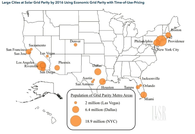 | Written by Wade | No Comments | Updated on Feb 7, 2013 The content that follows was originally published on the Institute for Local Self-Reliance website at http://ilsr.org/solar-costs-grid-prices-collision/large-cities-at-grid-parity-by-2016/