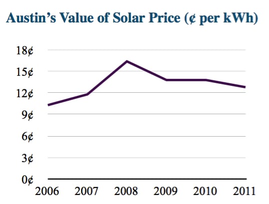 Austin has also supported the development of local solar resources, by pioneering a new concept: a “value of solar” production-based incentive. Currently set at 12.8¢ per kilowatt-hour, the incentive adds up various ways that local solar energy saves the utility money (including avoided energy costs, transmission of energy and losses, and other factors), and sets an appropriate payment level, adjusted annually, for solar energy producers.
