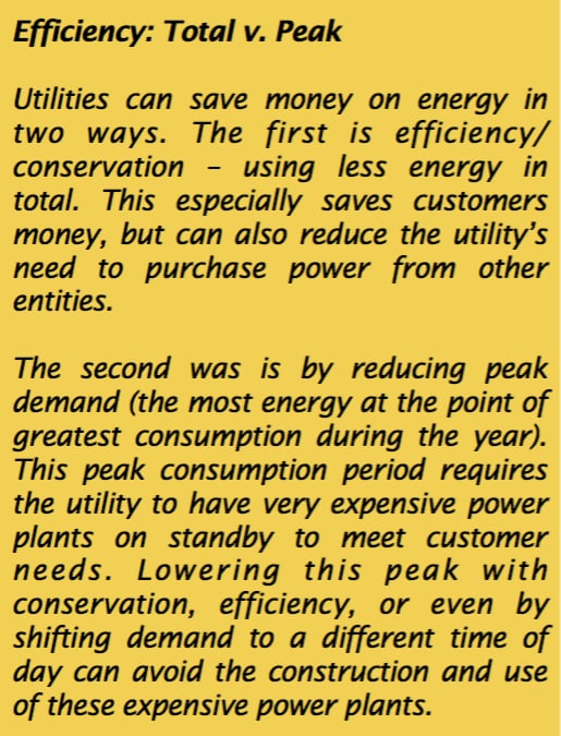 Clean isn’t the only focus. The community utility intends to save a nation-leading 2-3% of annual sales with energy efficiency, by increasing incentives, providing financing through the utility bill, and aggressive marketing.42 They also intend to use demand response programs (e.g. cycling customer air conditioners during times of peak energy demand) to reduce the peak energy use of the utility by 5%.43 Such measures can reduce energy costs by using less, avoiding purchases of expensive energy when it is in short supply, and by shifting energy demand to periods when energy is less expensive.