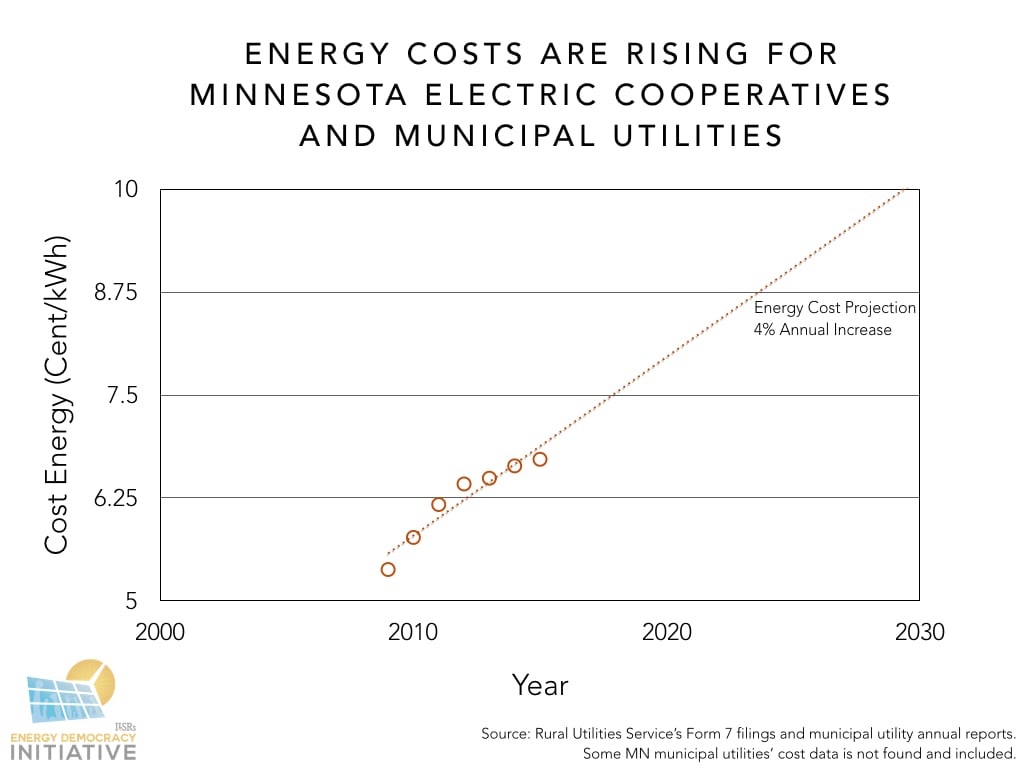 Costs are also rising to comply with environmental regulations, rules that utilities have known about for decades. U.S. environmental policy has steadily been progressing towards stricter air quality control since the 1963 Clean Air Act. This trend continues today, as represented by the impending Clean Power Plan (CPP), a shift towards renewable and carbon-free energy sources which Minnesota has already begun putting into action. Because of their past heavy investments in coal (in some cases mandated by the federal government) and current investments in natural gas, municipal and cooperative utilities are at a disadvantage. For example, 78% of the Southern Minnesota Municipal Power Agency’s (SMMPA’s) power is from the coal-fired plant Sherco Unit 3, which was built in 1987. Already, utilities have submitted plans to close Sherco units 1 and 2 in 2023 and 2026, respectively. Unit 3 may not be far behind.
