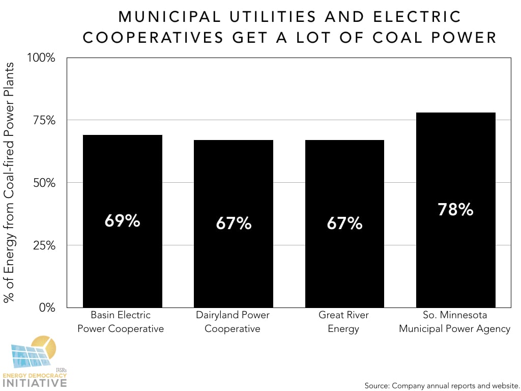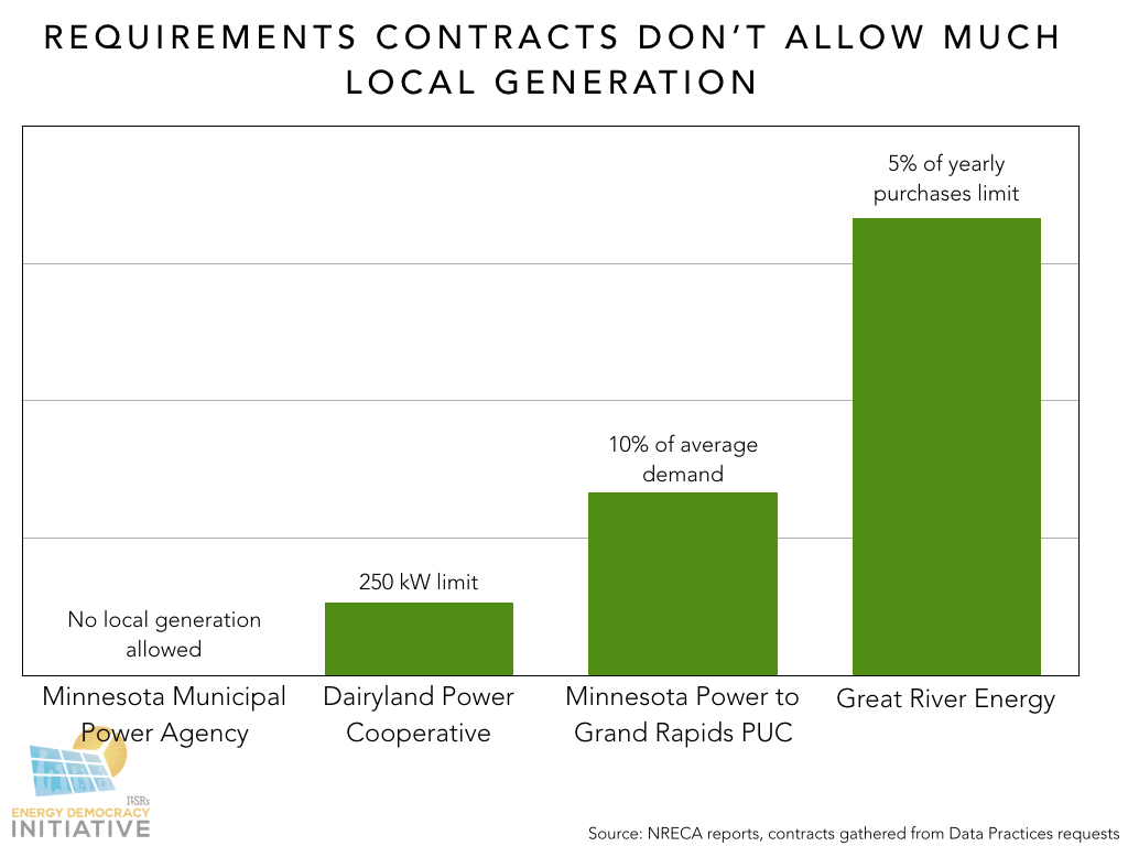 Many of these contracts are “all-requirements,” mandating that utilities buy the entirety of their power supply from the power agency or generation and transmission cooperative (or the maximum amount that the company can supply). These contracts keep local utilities tied to large investments in dirty power sources, and prevent them from increasing the role of locally-owned and/or locally-procured power generation. Of the twenty-eight cooperative utilities contracted with Great River Energy, twenty were all-requirements, with a five percent allowance for locally owned energy. Other utilities featured smaller allowances or none at all, as was the case with all the Minnesota municipal utilities whose data was available.