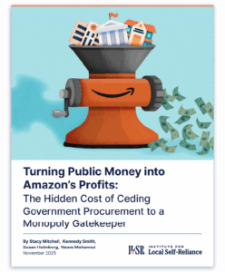 Contact your local government and school board officials and explain that an Amazon contract that lacks fixed, competitive pricing is a bad deal for your community and its taxpayers. Send them a copy of our report, Turning Public Money into Amazon‘s Profits. If they haven’t yet piggybacked on to a group purchasing contract with Amazon, ask them not to. If they have, ask them to stop using it — or to cut back on Amazon purchases and instead find opportunities to buy from local and regional businesses. Point out to them that, even if they have already piggybacked on to a group buying contract with Amazon, they are not obligated to use it.