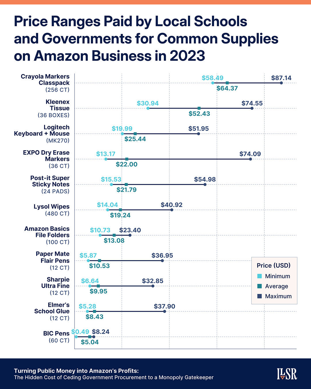 Unlike standard public contracts that lock in fixed prices, Amazon uses algorithm-driven pricing to continuously adjust what governments pay. The result is dramatic price variation: one city bought a 12-pack of Sharpie markers for $8.99, while a nearby school district paid $28.63 for the identical pack that same day. Our data contain thousands of similar examples, with some agencies paying double or even triple what others paid for the same items.