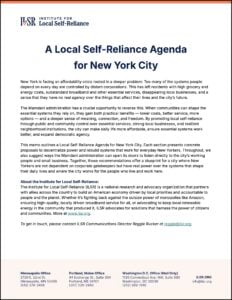 This memo outlines a Local Self-Reliance Agenda for New York City. Each section presents a mix of proposals. Together, these recommendations offer a blueprint for a city where New Yorkers are not dependent on corporate gatekeepers but have real power over the systems that shape their daily lives and where the city works for the people who live and work here.