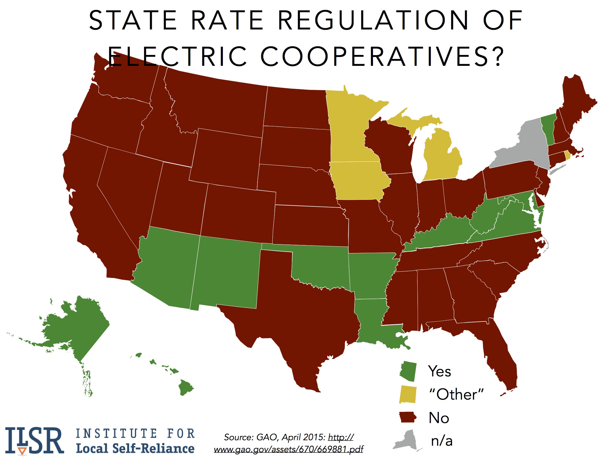 As mentioned previously, rural electric cooperatives are largely exempted from state oversight because their legal structure implies that members have a say in the governance of the organization. The following map, based on data from the federal GAO, illustrates how few states have any form of state regulation (red), and several that have only a limited form (in yellow):
