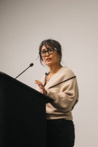 El discurso inaugural a cargo de Michelle Mondia, fundadora de la Alianza de Trabajadores de la Muerte, que reúne a profesionales BIPOC dedicados al final de la vida que trabajan con y en comunidades marginadas, invitó a los asistentes a establecer conexiones entre su trabajo de compostaje y los ciclos de la vida, la muerte y la transformación. Como asistente de fallecidos con 15 años de experiencia en funerales a domicilio, entierros ecológicos y prácticas de fin de vida con base cultural, habló sobre el innovador campo del compostaje humano. Michelle también habló sobre su trabajo como directora de programas en Land Together, donde ayuda a crear espacios de jardines curativos junto con mujeres encarceladas en el sur de California. Invitó a los participantes a reflexionar sobre lo que significa abrir nuevos caminos y compartió lo siguiente: